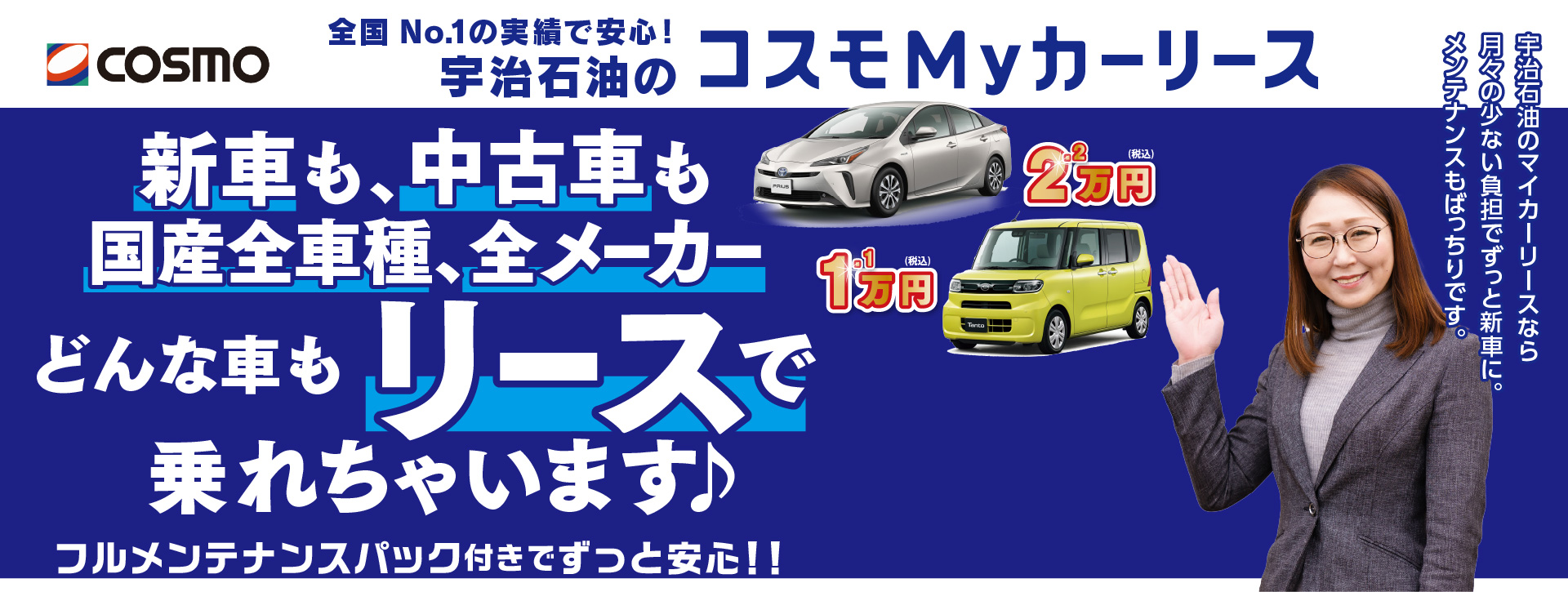 宇治石油グループの「コスモMyカーリース」なら中古車でもリース契約OK!国産全メーカー・全排気量リース契約OK!車検もメンテナンスも認定自社工場で安心です。