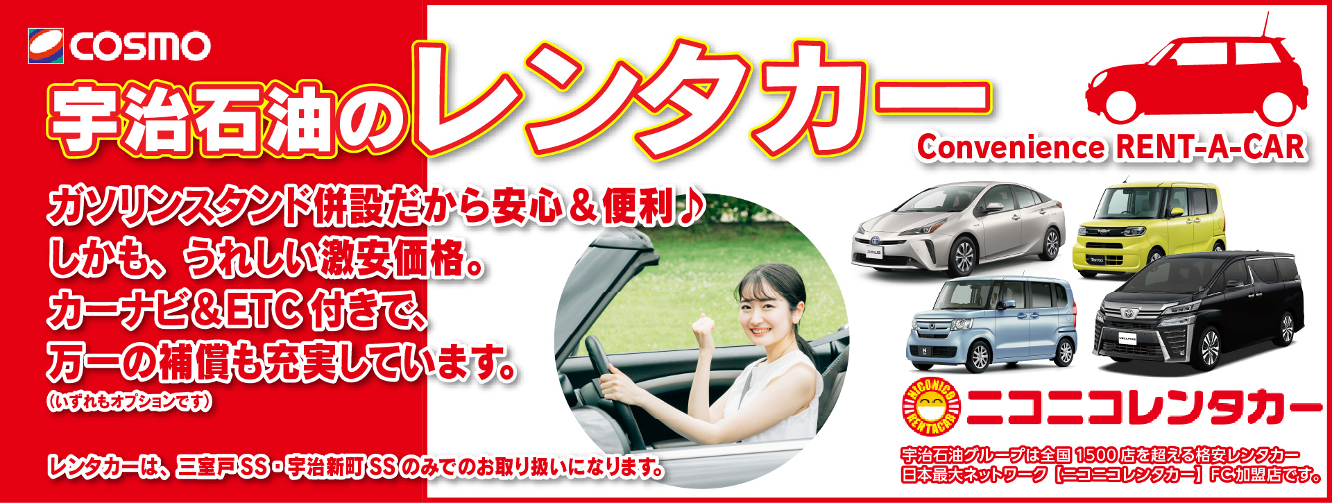 駅チカで宇治観光に、とても便利なレンタカー!京阪宇治駅・三室戸駅・JR宇治駅に近い、宇治石油のサービスステーションのレンタカーなら、レール&レンタカーでの観光にとっても便利です。