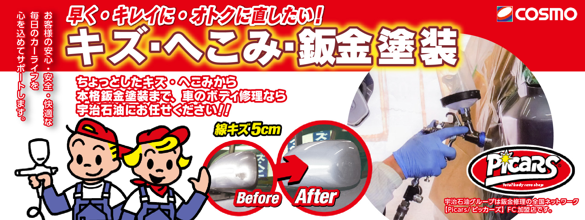 車のキズ・へこみの修理・リペアなら宇治石油のカーリペアにお任せ!全国ネットのピッカーズのノウハウ+安心の自社認定工場で、板金塗装よりも安く、早く仕上がります。