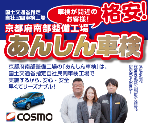 お手頃価格、格安車検です。宇治市・城陽市・久御山町で30,000台の車検実績!国交省認定工場・国家資格整備士によるあんしん車検。ハイブリッド車、電気自動車の車検もお任せください!